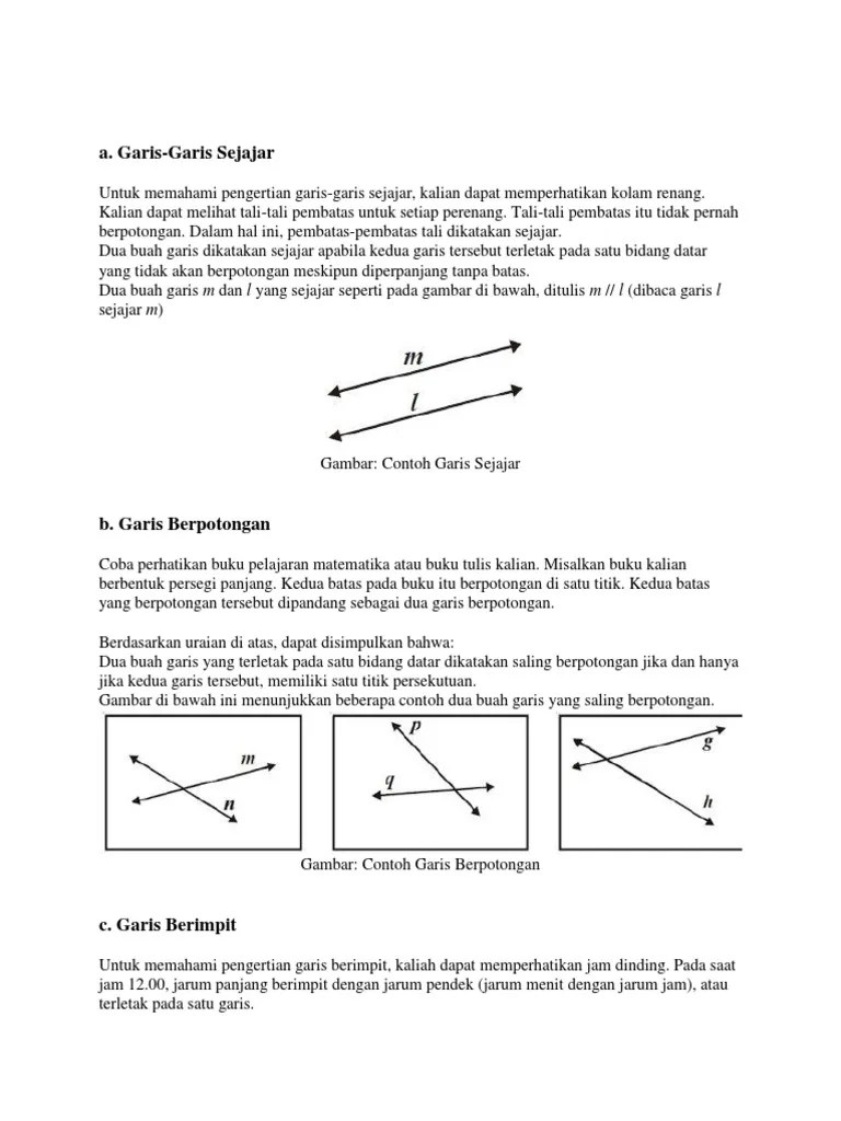 Dua garis berpotongan apabila terdapat dalam bidang yang sama dan saling bertemu pada satu titik. Dua buah garis atau lebih dikatakan saling berpotongan jika. Pada gambar di atas, garis m sejajar dengan garis n, dapat ditulis m // n. Klik link di bawah untuk jawaban lengkapnya:. Kemudian buatlah satu garis yang melaluinya!