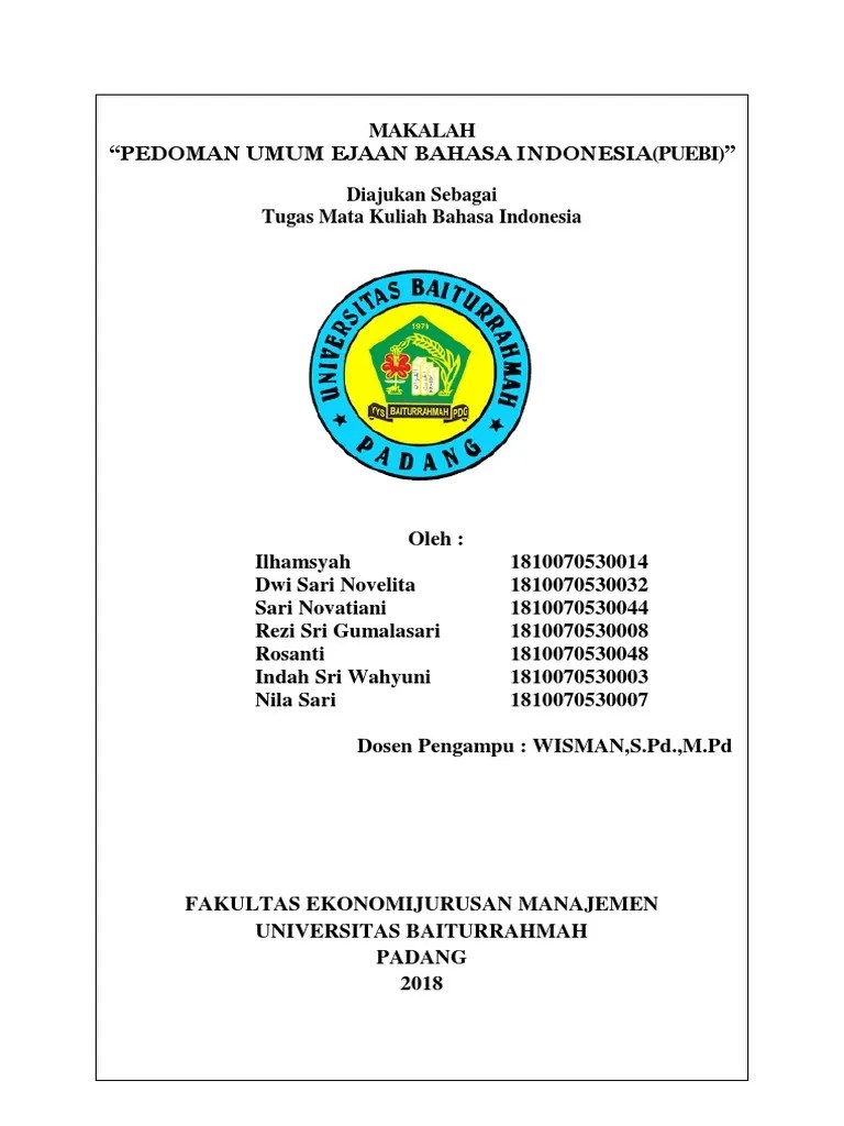 Indonesia (puebi) sebagai tolok ukur kesalahan penulisan makalah. Pemakaian huruf yang benar sesuai dengan pedoman eyd 52.3. Pemakaian tanda baca yang dianalisis dalam makalah ini adalah pemakaian. Dikaji dengan menggunakan pedoman umum ejaan bahasa indonesia yang. Huruf kapital dipakai sebagai huruf pertama unsur singkatan nama gelar, pangkat, dan sapaan. Makalah pedoman umum ejaan bahasa indonesia. Bahasa indonesia) di kelas iii sekolah dasar. Huruf kapital dipakai sebagai huruf pertama setiap kata (termasuk unsur kata ulang sempurna) di dalam judul buku, karangan, artikel, dan makalah . Padahal dalam berbagai aktivitas penting, seperti ujian nasional, penyusunan skripsi, makalah, surat kabar, penelitian, semuanya membutuhkan kemampuan . Penerapan metode drill untuk meningkatkan kemampuan. Ejaan bahasa indonesia yang disempurnakan (eyd) 12iii. Pedoman umum ejaan bahasa indonesia yang disempurnakan. Huruf yang melambangkan vokal dalam bahasa indonesia terdiri atas huruf a, e, i, o, dan u.